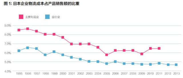 从日本物流行业的数据来看,从1995年到2003年,日本物流全行业的企业物流成本占产品销售额的比重,逐步下降了近一个百分点,而后从2003年以来,维持在5%左右的稳定水平。而美国在2012年企业物流成本占产品销售额的比重数据为7.87%,2013年企业物流成本占产品销售额的比重为8.41%,高于日本且呈现上升趋势。